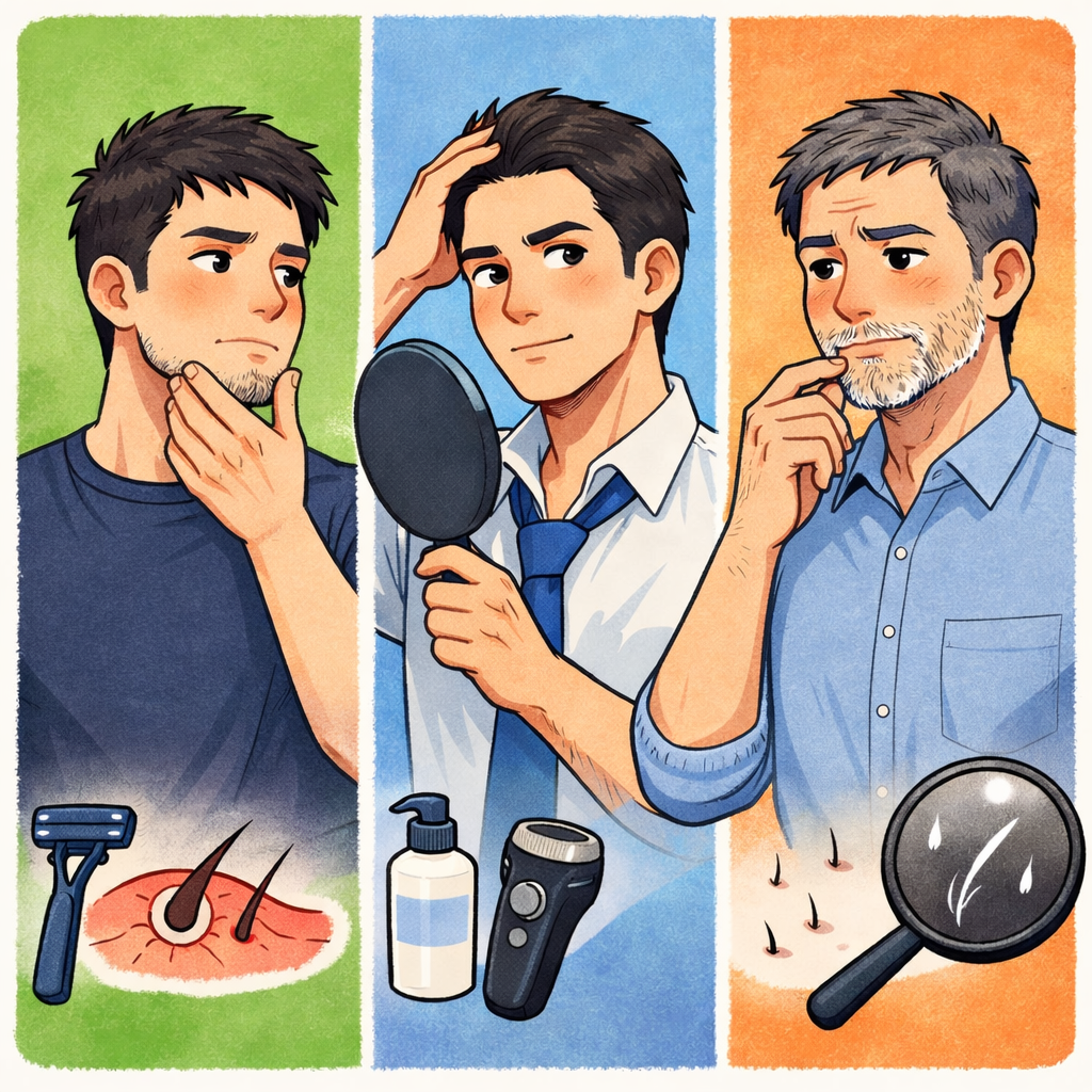 さらに、個人差はありますが、ヒゲや体毛に白髪が混じることも出てきます。白髪が増えると、剃っても黒い毛のような“青さ”は減る一方で、処理しきれない毛が残って見えるなど、別の悩みに変わることがあります。